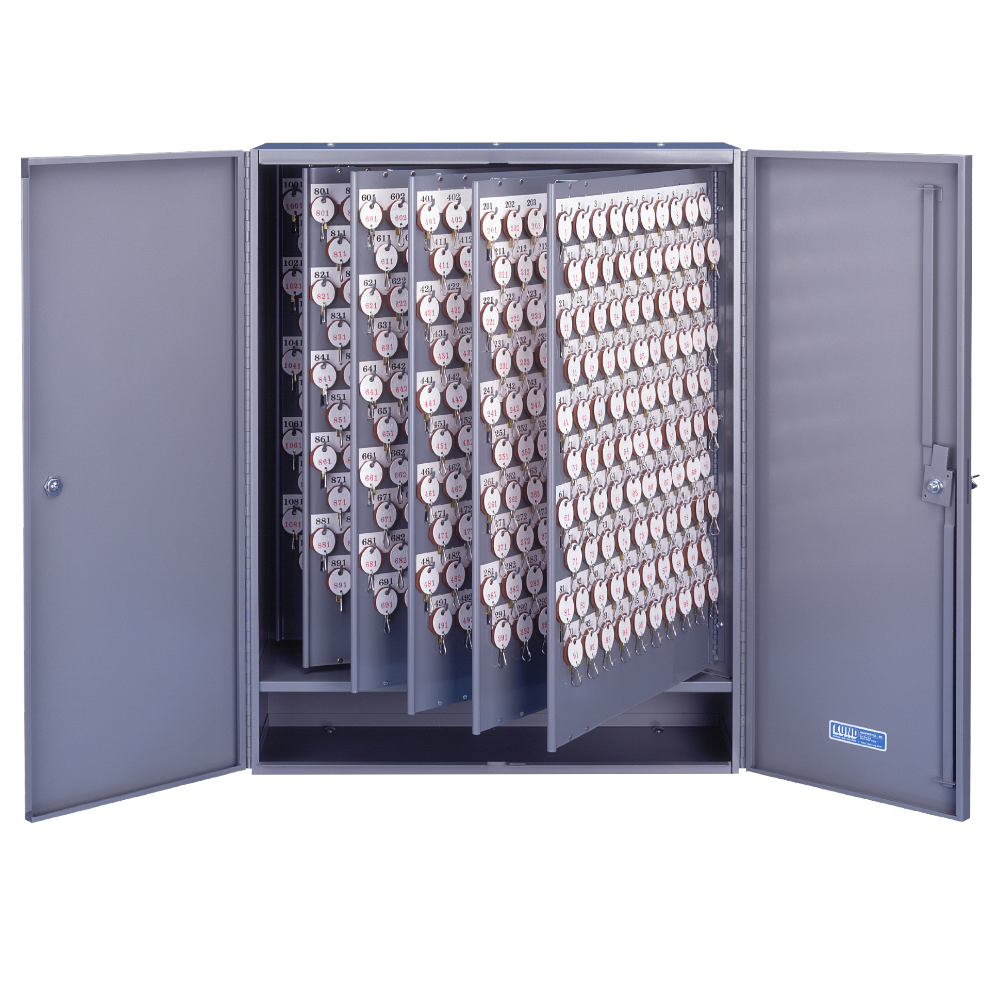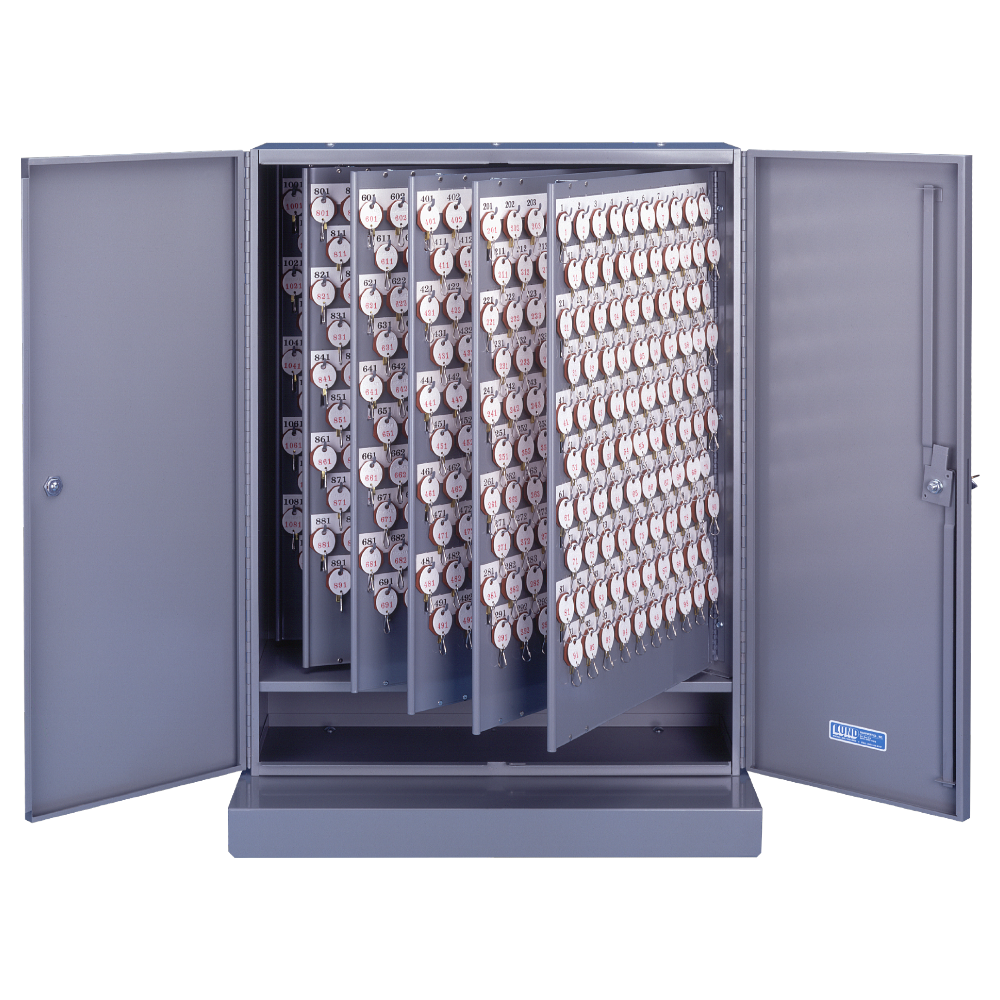 Lund 1800 double door key cabinets come furnished with the complete 2-tag system, 1-tag, or no tag system. The 1800 series houses 700-1200 hooks with the capability of holding 3-4 standard keys per hook. The cabinet is made from 18 gauge steel, with 20 gauge panels and a 3 point locking device.