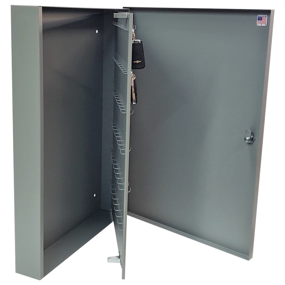 Lund Automotive key cabinets come furnished with labels and shields numbered or blank. Our 551 fixed panel 5-inch deep cabinet houses 240 hooks with the capability of holding three standard keys or one key fob per hook. The cabinet is made from 18 gauge steel, with 20 gauge panels and a 3 point locking device.
