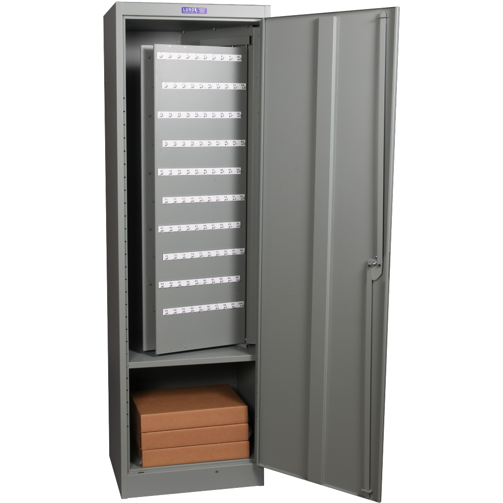 The Lund Special D-Line floor model is ideal for a large number of auto/fleet keys. This cabinet comes furnished with numbered or blank labels and shields. Our D-Line Special houses 400-800 long L shaped hooks, has extra row to row spacing with large spacers between panels to help accommodate bulky key fobs. Cabinet is made from 18 gauge steel, with 20 gauge panels and a 3 point locking device.
